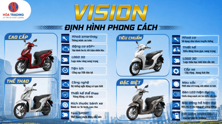 📢 HONDA VISION : ĐỊNH HÌNH PHONG CÁCH CÙNG 4 PHIÊN BẢN Xe máy Honda – Bền bỉ đồng hành, Tiết kiệm vận hành SH 125i – ĐẲNG CẤP DẪN ĐẦU, GIÁ SIÊU MỀM THAM GIA KHẢO SÁT – RINH QUÀ LIỀN TAY HÓA Trading UY TÍN., CHẤT LƯỢNG. Xe máy Trả góp Sửa chữa Khuyến mãi Phụ tùng Địa chỉ CTKM Tin khuyến mãi 21/04/2026SH 125i – ĐẲNG CẤP DẪN ĐẦU, GIÁ SIÊU MỀM 20/04/2026THAM GIA KHẢO SÁT – RINH QUÀ LIỀN TAY 14/04/2026WINNER R – TỐC ĐỘ BẢN LĨNH 12/04/2026RỰC RỠ CỜ HOA -BÙNG NỔ ƯU ĐÃI: MỪNG ĐẠI LỄ 30/4 – 1/5 25/03/2026[VISION] BẬT SẮC TỰ TIN – CÂN MỌI OUTFIT xe máy Tin xe máy 23/04/2026HONDA VISION : ĐỊNH HÌNH PHONG CÁCH CÙNG 4 PHIÊN BẢN 22/04/2026Xe máy Honda – Bền bỉ đồng hành, Tiết kiệm vận hành 19/04/2026TOP 4 DẤU HIỆU XE CẦN THAY NHỚT 16/04/2026AIR BLADE 125 – BẬT CHẤT RIÊNG, CHẤT NGẦU MỖI NGÀY! 15/04/2026LỐP XE – NHỎ NHƯNG QUYẾT ĐỊNH AN TOÀN LỚN! HÓA Tin công ty HỆ THỐNG HÓA TRADING CHÚC MỪNG NGÀY QUỐC TẾ PHỤ NỮ 8/3 08/03/2026 HEAD HÓA CẦN THƠ | VINH DỰ ĐÓN TIẾP LÃNH ĐẠO CẤP CAO HONDA VIỆT NAM 05/03/2026 THÔNG BÁO LỊCH NGHỈ TẾT BÍNH NGỌ 2026 12/02/2026