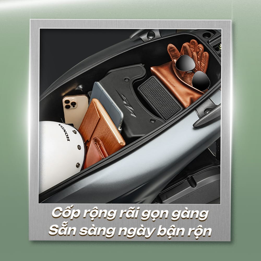 Cốp dưới yên rộng rãi kết hợp hộc để đồ phía trước, thao tác gọn gàng, sẵn sàng cho mọi lịch trình bận rộn.