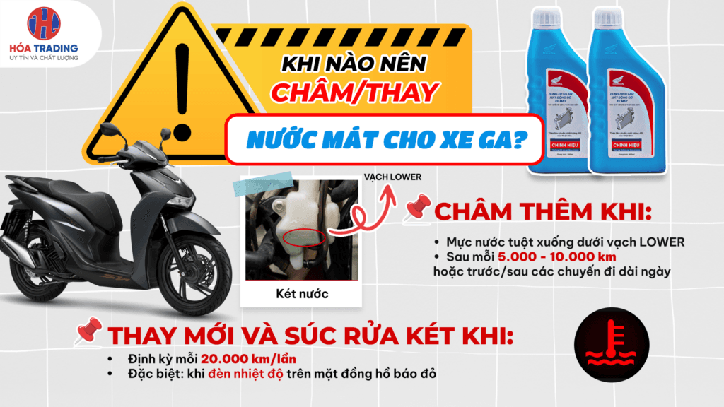 Áp dụng khi nước trong bình phụ báo dưới vạch LOWER, hoặc sau mỗi 5.000 – 10.000 km.