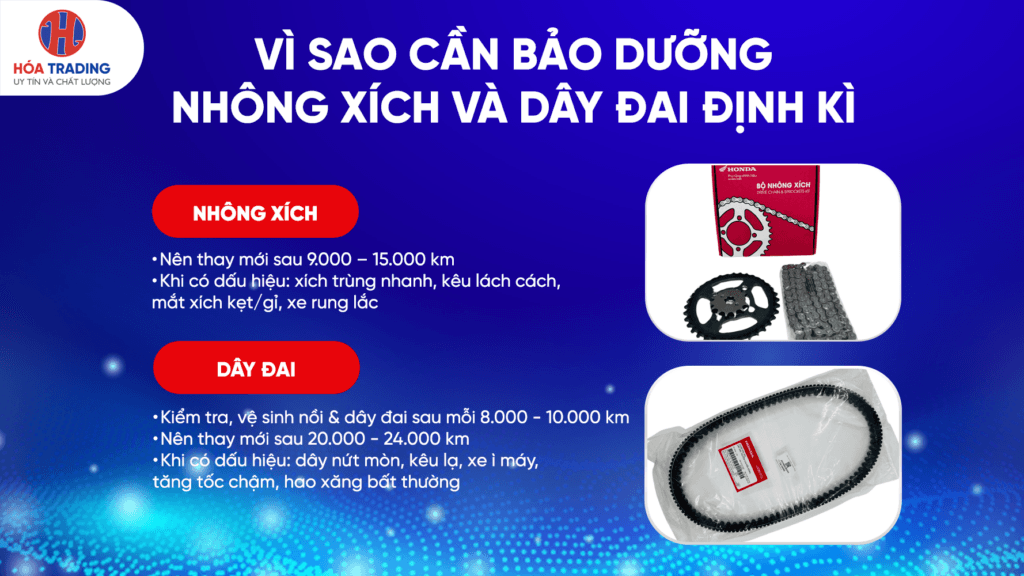 Nếu không thay đúng hạn, nhông xích dễ bị chùng, kẹt, gỉ sét; dây đai dễ nứt, mòn, gây rung lắc, xe yếu và hao xăng bất thường.