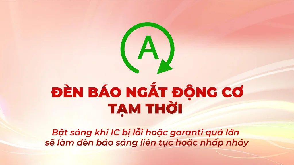 Loại đèn báo này có ký hiệu chữ A có thêm mũi tên bao quanh. Bật chức năng này đồng nghĩa với việc xe của bạn sẽ tạm thời ngắt khi xe dừng tại chỗ quá 3 giây. Đây là một cơ chế khá thông minh, giúp bạn tiết kiệm được nhiên liệu, đồng thời giảm được lượng thải khí ra môi trường, bảo vệ động cơ một cách tốt hơn.